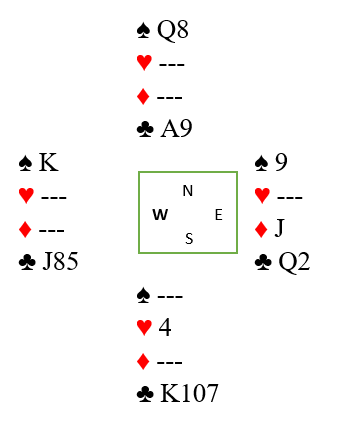Å melde 1NT stemmer med hensyn til styrken, men det se ikke særlig appetittlig ut med singel hjerter. Han kan ikke si 2 ruter da det er en reversmelding og viser meget sterke kort. Hvis å støtte svarers farge alltid må innebære fire kort i fargen gjenstår 2 kløver. Det er en grusom melding med disse kortene, og det innebærer nesten alltid sekskorts farge. Så svareren vil ofte (og bør) passe med svake kort og kanskje singel kløver.