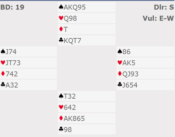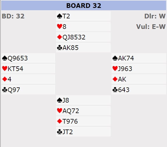 Åpningen var Multi, svake 2 i major eller en 20-21 grandhånd. Jan sin dobling viste ruterstyrke og min 2 NT var krav, jeg vet vi skal minst i utgang og Jan meldte 4 ruter « for det er det jeg har»- stilI gunstig sone kan det lønne seg om 7 stikk kan skrapes sammen. Nå hadde trolig Tormod lite bortkastet i ruter så jeg sjanset på 6 spar. Rundt til Johannesen igjen og tre trekk høyere, men skitt la gå og 7 ruter kom opp. Tre ekstra bet vil her koste 900 ekstra, men 500+ 900 er jo billigere enn 1430 hvis 6 spar står er logikken. Og det stemte siden Eva hadde enorm støtte i form av 4 kort ruter og en kløverfarge som matchet Jan sin hullete trekort «sidefarge». Alt vi fikk var 2 stikk i hjerter, 1 i spar og 1 i ruter. Da Tormod bare hadde singelton i kløver var 6 spar ikke til å rokke, men 7 ruter altså «god stamp», men det var mot en lilleslem som neppe blir meldt uten Jan sine sperreforsøk.