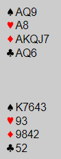 Det blir dog en grense for hva som kan gjøres om på (undo), synes jeg. Hvor den grensen går vet jeg ikke, men det er kanskje noe som må avklares for senere arrangement av denne typen. Jeg klikket selv feil et par-tre ganger. Kun en gang kostet det. Jeg skulle stikke meg inn på kløver ess og så bestemme meg for fortsettelsen. Da jeg satt og tenkte på fortsettelsen hadde spillefører fortsatt med en kløver, og jeg satt der og tenkte! Jeg hadde i stedet for å stikke med esset lagt kløver 8, kortet som stod ved siden av esset. Burde jeg nå fått undo?