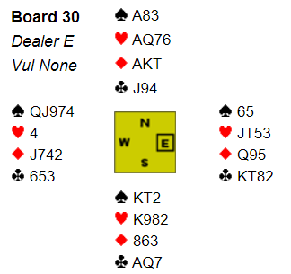 I den nevnte IMP-turneringen i forrige uke noterte fem av 11 Ø/V-par +620 i 4 hjerter. To par var i 3NT og gikk raskt med idet N/S tok fem kløverstikk, og fire spillefører la ned ruter ess og fikk tre rutertapere og en kløvertaper..