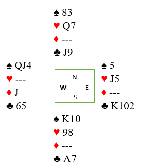 Det er kanskje ikke helt bombesikkert hva som er riktig her. Begge motspillerne kan muligens være kort i ruter, men første tanke er at mest sannsynlig har syd noen rutere siden han hadde singelton trumf. Fargen sitter ofte 3-2 her, og da er det maksimalt to tapere i fargen, no problem. Men kan syd har fire ruter, for eksempel K-Q-10-x?