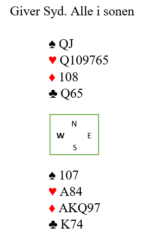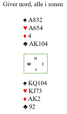Makkeren viser tre nøkkelkort, altså har han spar ess, hjerter ess og kløver ess. Nå må det satses på slem. Og det må være en bra storeslem her om makkeren har spar ess, A-Q i hjerter og A-K i kløver. Det kan syd finne ut!