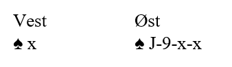 La oss si det ikke sitter kløver Q-J-x tredje, men at vest følger kun to ganger. Da vet du at øst har fem kløver som sammen med tre hjerter og minst tre ruter = minst 11 kort!. Det betyr at øst ikke kan ha fire spar lenger. Hvis det i såfall sitter 4-1 må det være vest som har fire spar. Du spiller spar konge. Om øst følger med nieren kan du trygt spille damen i fargens andre runde uten å stå i fare for å bli lurt av øst med J-9-x-x.