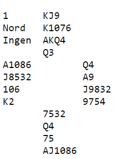 Er trumfen ikke verre enn 3-1 imot er kontrakten sikker men hvordan spille sparfargen? Nord dro selvsagt først trumf til A og K men Vest hadde hj DJ4 så der var det taper. For å sjekke sitsen stjal Nord kløver, dro ruter til kongen og stjal siste kløver også. Og deretter ruter dame og ny til esset som Vest stjal og slo opp igjen kløver til stjeling. Siste ruter ble spilt til bordet og spar derfra. Enig?