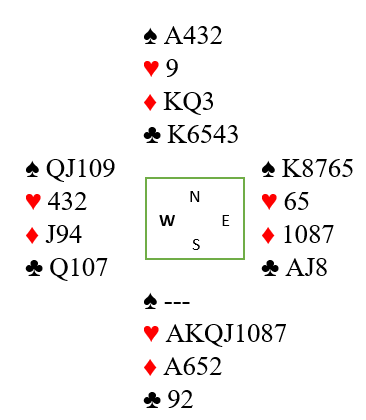 Sparutspillet bør trumfes på hånden. Vent med spar ess til du vet hva du bør kaste! Så tas trumfen ut i de nødvendige antall rundene før du tester ruteren med ruter ess fulgt av K-Q slik at du er inne hos nord idet du finner ut rutersitsen. Sitter fargen 3-3 står håndens fjerde ruter, og du kaster en kløver på spar ess:
