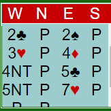 Øst sa 4 ruter som var kontrollmelding med støtte i hjerter. Ved det bordet var det vest som spurte med 4NT, og over svaret "0 nøkkelkort" sa vest 5NT som bekreftet at alle nøkkelkortene inkludert trumf dame var på plass (storeslemsinvitt). Det var nok for Evenstad som melde 7 hjerter. Han så at sparfargen måtte kunne gi uttelling, og slik var det. Pluss 2140 og uavgjort spill.
