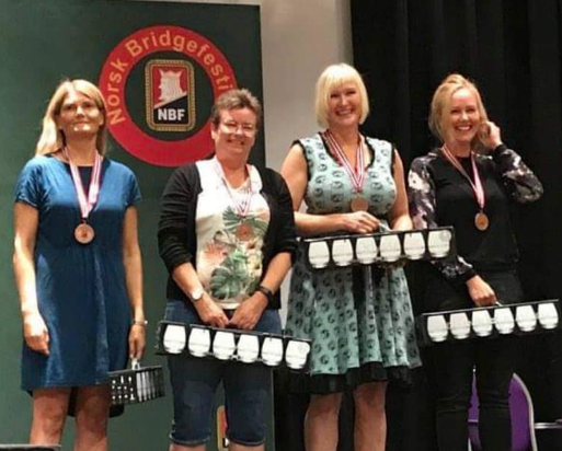 Ved vårt bord åpnet jeg med 1 kløver, Arne svarte 1 spar og så viste jeg 18-19 HP ved hopp til 2 NT. Arne har god støtte, 13 hp og 5- kort spar, og mer enn utgang kan stå med 31-32 poeng. Likevel valgte han bare å melde 3 NT og da var det naturlig for meg å stoppe der. Reuter ut var det verste å få, men jeg så jo at sitter de sorte fargene greitt er det 12 stikk rett ned. Valgte likevel å smyge første stikk og damen i Øst vant. Ny ruter dro J, K og ess og så gikk jeg løs på kløverfargen som var best. Men etter kl J og mer var Øst utsolgt, hallo- 5-1 imot og Vest har da steng for 5. runde. Da prøver vi sparfargen, Liten til kongen og ny opp til esset og Vest som først la 9-eren var utsolgt i 2. runde. Altså var mine «12 sikre» vinnere redusert til 10, men man spiller jo videre. Etter sp A tok jeg for resten av honørene i kløver og da Øst følge at hjertersitsen ikke burde røpes gikk en ruter. Da spar til damen og Vest sakte ruter var jeg litt på hugget igjen -og valgte å sette inn Øst på sp J som sto. Og da Øst ikke hadde flere rutere igjen var resten mitt, sp 5 og de to stå-stikkene i hjerter tok resten. Nesten gledelig å se at hj D satt gardert i Vest så at vi var beskjedne ville nok lønne seg siden slem ikke kan stå. Men den gang ei! Bare to bord ellers var i utgang, de fire siste spilte slem og to av dem vant.