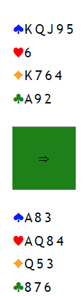 Hvis singel ruter konge singel beholdes i sluttposisjonen, og en hjerter forsvinner fra syd i stedet vil det se slik ut med fem kort igjen: