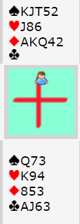 Du har jo 11 omtrent 100% sikre stikk, men hva har makker til hjlp? Faren er at trumfen ikke sitter uten at det blir taper der og har makker en konge er det alltid lilleslem. Men hvordan få meldt? Terje Solli og jeg bruker tvetydig avslag på kravåpningen 2 kløver med ikke «seckond neg» på åpners fargegjenmelding, og da bestemte jeg meg for å vise ekstrem styrke i poeng og spillestyrke ved hopp til 5 hjerter, men Solli passet likevel ned. Og normalt vil det være høyt nok?