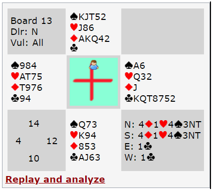 Vest spilte ut hj 2 (norske), jeg ville jo spille trumfen fra bordet og prøvde derfor hj D som vant stikket. Trumf til 3, K og 2 fulgte. Ruter til esset og så ny trumf der Øst stakk med esset og Vest la 8-eren. Håp om å unngå mer enn 5 tapere var der. Kl A fra V med styrke fra Øst, så kl D der jeg la knekten og deretter ruter til damen i Vest og min konge. Vinner jeg nå? Ruter til 6-er fra Øst og sp 9 fra meg men Vest kunne stikke over med sp 10. Deretter ble kl K tatt og så kom hjerter 3 som jeg slapp men Vestkunne stjele med sp J. Og da var det -1 og 11-31 til oss.