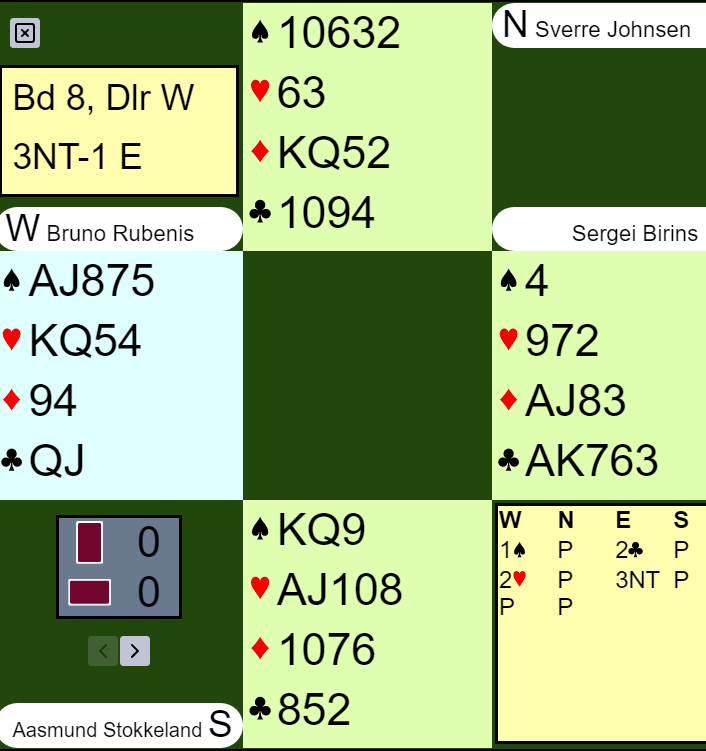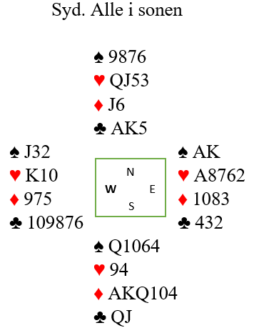Der er det som du ser to sikre trumftapere og to tapere i hjerter, og det kan ofte være en tredje trumftaper også. Ideelt burde de spilt 2 spar! Eller, når man ser alle kortene kunne de vært i 3NT. Det er ikke lett å finne med 4-4 tilpasning i en majorfarge og en dobbelton på den ene siden, to dobbeltoner på den andre. Men i grandkontrakt er det åtte toppstikk i minorfargene og må bli ett stikk til - det niende - i enten hjerter eller spar.