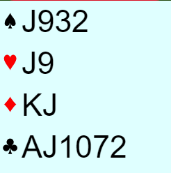 Jeg har tro på en såkalt tight-aggressiv stil. Dvs. åpne tynt med fordelingshender, spesielt hvis fargen(e) er bra så det kan gå bra også om det ikke er tilpasning i noen farge. Med jevn fordeling tror jeg det er best å passe med 11, spesielt om det er 4-3-3-3 fordeling. Med 4-4-3-2 erl nok noen få hender med 11 er bra nok, da kaller jeg dem 12 poengere.