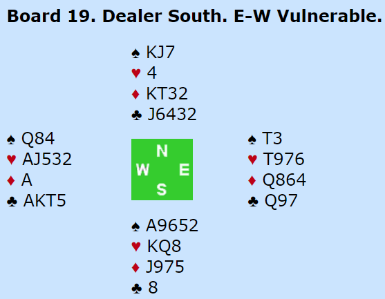 Med kløver ut var det helt håpløst. Spillefører dengte ned trumfesset og en til som ofte fører frem, og han er dessuten redd for å slippet dem inn siden det ser ut tiol at de kan få kløverstjeling. Dermed tapte han to trumfstikk og to sparstikk.
