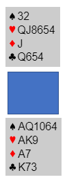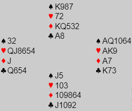 6 ruter er på en måte beste slem, men altså ikke den som kan vinnes med åpne kort for begge sider. Men 6 hjerter vinnes! Idet hjerter dame spilles oppdges sitsen, og en markert hjerterfinesse tas over vests knekt fjerde. Dermed blir det kun en kløvertaper.