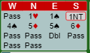 Rogeir Paulsens (syd) sin 1NT var overføring (viste kløver). Senere meldte han kanskje litt sprekt (?) 6 ruter, men det var på alle måter riktig (5 spar stod jo). Slemmen ble doblet, og øst kan selvsagt ikke klandres for at han ikke fant "double dummy utspillet" liten kløver som kunne ført til hjerterstjeling og en bet.