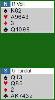Voll spilte hjerter ess og mer hjerter, og det kan neppe kritiseres med den informasjon han hadde. Men da ble det to hjertertapere, en rutertaper og en spartaper - en bet.