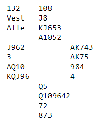 Endelig, godt ut i andre dag meldte det seg endelig en mulighet for vår gode venn til å briljere. Så godt fornøyd med egen innsats var han at han nå presset makker til å nominere spilleføringa til NM-helgas spill! Slipp'en var motvillig og flau, men den uheldige engerdøl insisterte: "Kom igjen, makker! Lignende vil jo ikke bli rapportert på hele helga; det bør jo anses som en borgerplikt å fremme slike spill!" Dermed endte det slik at Slipp'en rapporterte følgende spill til kåringa av NMs beste spilleføring: