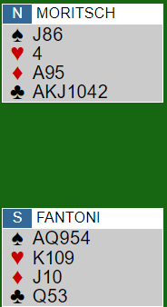 Skadefryd er den beste fryd heter det. Jeg har ikke veldig sansen for å harselere med folk når de har gjort noe som ikke var så lurt (bortsett fra litt vennlig terging av venner), og spesielt ikke i en bridge blogg som er ment å være ganske seriøs. Men i dette tilfellet er det for fristende. Og det er jo slik at toppspillere må finne seg omtale også når de gjør noe dumt. De får jo masse spalteplass når de har gjort noe bra. Så det er rett og slett for fristende å fortelle dette spillet hvor de aller fleste spillerne i din lokale klubb ville spilt mye bedre enn Fantoni. Dessuten er det vel fint for vanlige spillere å se at også proffer av og til ender opp med å spille en slags smygkasino i stedet for bridge?