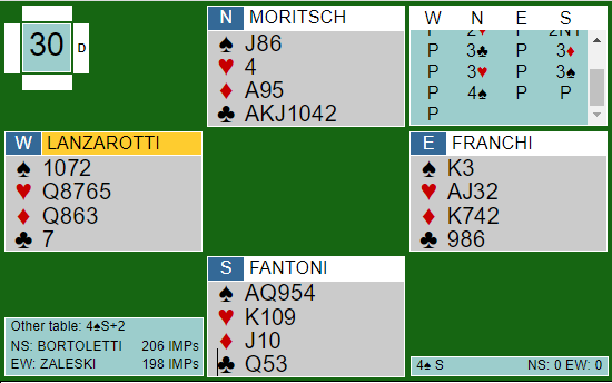 Her startet det å gå i surr for italieneren. Han begynte nok å tenke på hvor galt det kunne gå om øst hadde K-10 fjerde i trumf fra start, og/eller om vest hadde fire spar og hadde ligget unna med trumfkongen. Hvis esset spilles og det sitter 4-1 i trumf blir det fort trøbbel, spesielt om hjerter ess sitter bak kongen.