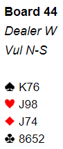 Det kan være farlig å dra slik tankegang for langt, for noen ganger har lagkameratene fått til en kanonliste ved det andre bordet så ødelegger du selv alt ved en desperat aksjon i troen på at noe spesielt må skje. Men vest følte seg sikker på at de lå under med omtrent 50 IMP, noe måtte skje. Derfor åpnet han med 3 kløver, ren bingobridge.