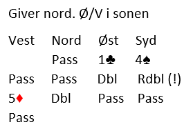 Øst kunne kanskje i stedet for å doble sagt 5 kløver. Det blir kostbart det også, kanskje litt billigere enn 5 ruter doblet hvor det ble fire doblede bet med to spartapere, en hjertertaper og tre rutertapere, N/S +800. På en måte reddet vest 80 poeng i forhold til å la syd spille 4 spar redoblet.