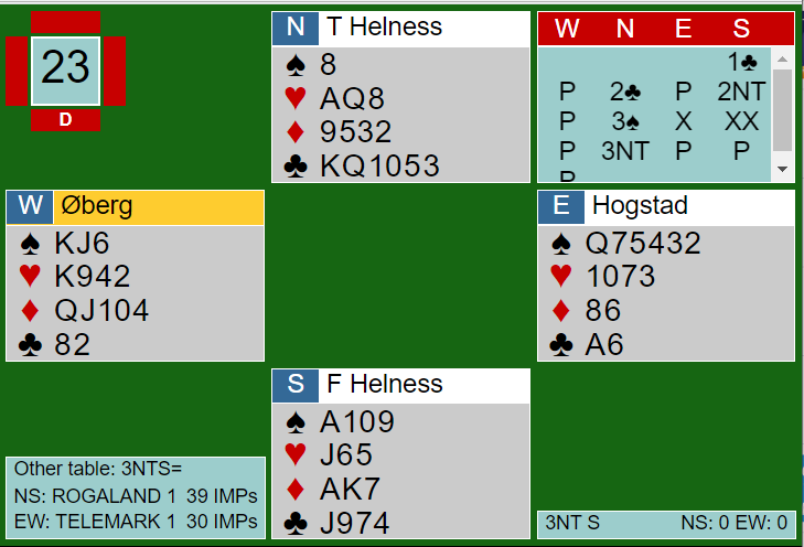 Nords 3 spar over 2NT viste singelton. Nå fikk Hogstad sjansen til å doble for utspill, og det var sannelig gunstig for han siden makkeren vartet opp med K-J i fargen! Øberg spilte ut spar konge mot 3NT. Spillefører lå unna to ganger spar og ville hatt en sjanse om kløver ess satt sammen med tre spar, men her ble det raskt to bet.