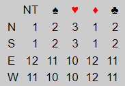 Det ser ikke enkelt ut da heller, for nord kontrollerer hjerteren, og syd har alt i spar. Men computeranalysen som forteller «double dummy» hva som teoretisk sett (åpne kort) kan vinnes ser sånn ut: