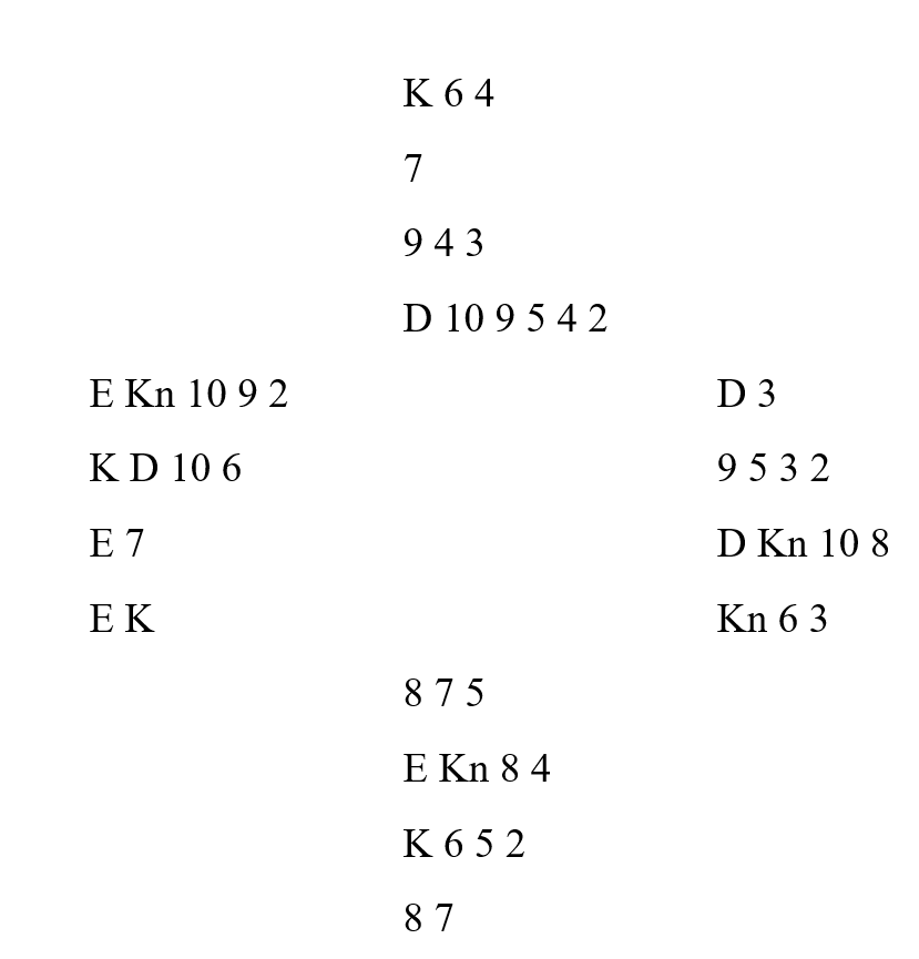 Kontrakten var 3 NT, og utspillet kløver ti til kongen. Sparknekt fikk beholde stikket, men en liten spar måtte Nord ta med kongen. Nå var det ikke lenger noe inntak til kløverne, og Nord skiftet til hjerter til esset og mer hjerter til kongen. Når jeg nå tok de svarte stikkene, måtte Syd gå ned til dobbel hjerter og ruter konge dobbel. Hjerter dame og mer hjerter spilte han inn, og ruteroppspillet i saksen ga 10 stikk og 10 plusspoeng.