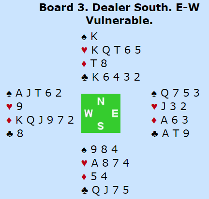 Her var Vest giver med ingen i faresonen og Jon (V) åpnet med 1 hjerter. N passet og Morten med 14 hp vlgte bare å kreve med 2 kløver der mange simpelt hen svarer 4 hjerter. Syd passet og med 16 hp av god kvalitet og tilpasning til makkers 4+ kløver valgte Andersen å vise styrke med hopp til 3 hjerter. Burde nok vært med 6 kort men det gjorde at Andresen fikk slemambisjoner. 4 NT med svar 5 kløver (0/3 ess) viste at alle ess var på plass og 5 NT avslørte at Jon ikke hadde noen umeldt konge. Dermed ble kontraktten satt til 6 hjerter. P 5 ut og Jon så jo at det gjalt å unngå to tapere i trumf siden K og D samt ttre små trumf var ute. Honørene fordelt og 3-2 imot i fordeling vil gi vunnet spill. Likeså med begge honørene i Syd. Men hva med 4- og fordelte honører+ Hvordan ville du spilt trumfen- kanskje et avgjørende valg? Det er vel naturlig å spille fra bordet mot hånden, altså stikke sparen i bordet og trumf derfra- men hvilken? Mange velger å spille høyt fra bordet når det er svakt i trumf, altså hj 9 men Jon valgte hj 3 i 2. sttikk. Da Syd måtte på med hj K kunne den stikkes og ny ttrumf spilles mot 9-eren i bordet. Nord hadde hj D874 og med valget som ble gjort fikk Nord bare ett stikk i trumf. Spilles hj 9 fra bordet og kongen presser ut esset vil Nord sine hj D87 igen gi to stikk og bet. Bare Andresen- Andersen kom i lilleslem og ikke alle vant 12 stikk i hjerter- konttrakt.