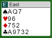 Det er en 50% sjanse, kanskje litt mindre fordi det mangler inntak til øst for å kutte opp sparen om syd har alle fire (K-9-8-4). Likevel, det er et sånt spill som er omtrent hipp som happ, slem står omtrent halvparten av gangene. Men om Ø/V melder i fred kan de finne ut det mangler to nøkkelkort (spar konge og hjerter ess). Slem kan jo godt stå likevel ve hjelp av en finesse når det er ett ess og trumf konge som mangler, men når to nøkkelkort mangler stopper man normalt i utgang fordi det kan jo være to ess som mangler. Og så er det slik da at det ikke er alltid slik at man får anledning til å finne ut om hvor mange nøkkelkort som mangler.