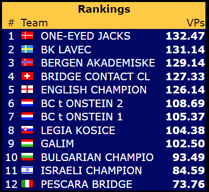 Og det ble faktisk litt spenning. BAK tapte mot Bridge Contact, men akkurat med en sånn margin at det norske laget holdt seg foran dem. Og det var det tryggeste, for English Champion fikk til storseier og havnet like bak topp-4 til slutt. Slik ble tabellen seende ut til slutt, med Danmark foran Sverige og Norge like bak på 3.plass: