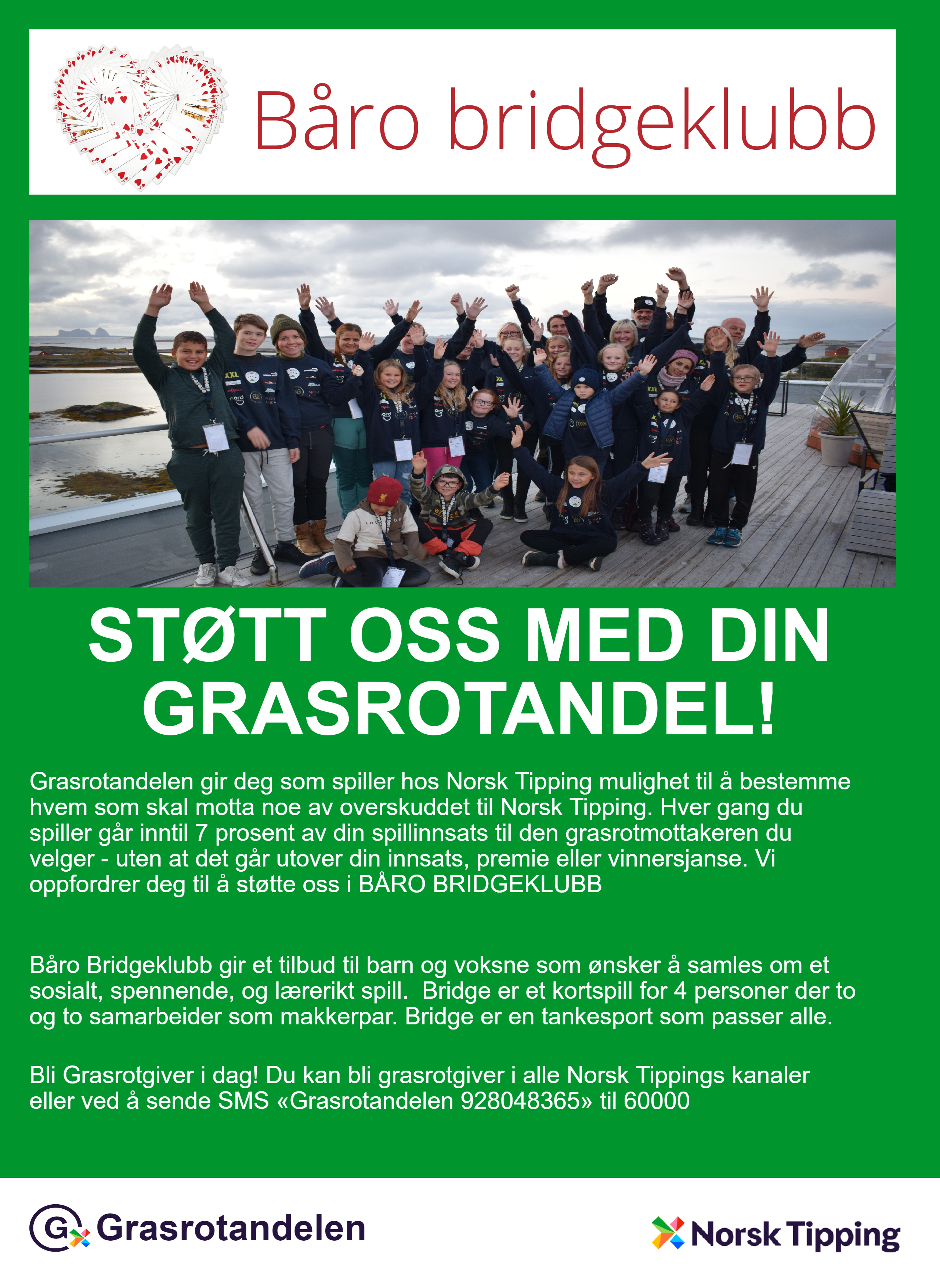 Velg Båro Bridgeklubb som din grasrotmottaker ved å sende sms "Grasrotandelen 928048365" til 6000. Det koster ingenting, annet enn 1 minutt av din tid, og ungene i Båro BK vil få 7 % av det du tipper for fra Norsk Tipping.