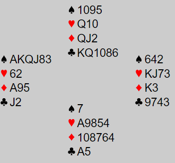 Merk at det står faktisk i 4 spar Ø/V om hjerteren tippes. Både Verdal og Heimdal som N/S hadde system og avtaler så de kunne åpne på to-trinnet med N/S sine kort, og da ble det ikke så lett for Ø/V. Og ved begge bort ble kontrakten 3 ruter spilt av syd. Spar kom ut begge steder, og spar i fortsettelse til stjeling fulgt av en tredje runde spar idet øst kom inn på trumfkongen i tredje stikk.