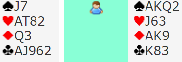 Men her kan å legge ned kongen koste kontrakten noen ganger. Det er klart at om kløveren sitter 3-2 er det null problemer med å vinne 6NT, du kan ikke tape mer enn ett stikk i fargen. Det eneste som betyr noe da er om det blir tolv eller tretten stikik. Men hva om kløveren sitter 4-1?