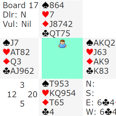 Her var safespilling av kløverfargen nødvendig (selv om 6NT kan vinnes med åpne kort selv om kløveren bommes, fordi hjerteren kan gi tre stikk).