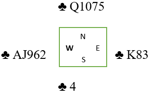 Vel, du startet altså med esset og spilte liten fra vest i den hensikt å legge åtteren om nord fulgte på med liten. Hvis syd er den som har fire har ikke nord kløver andre gangen så du vet plutselig sitsen. Da gås opp med kløver konge fulgt av liten mot knekten tredje gjenværende hos vest. Syd har igjen kun Q-10 og kan ikke få mer enn ett stikk.