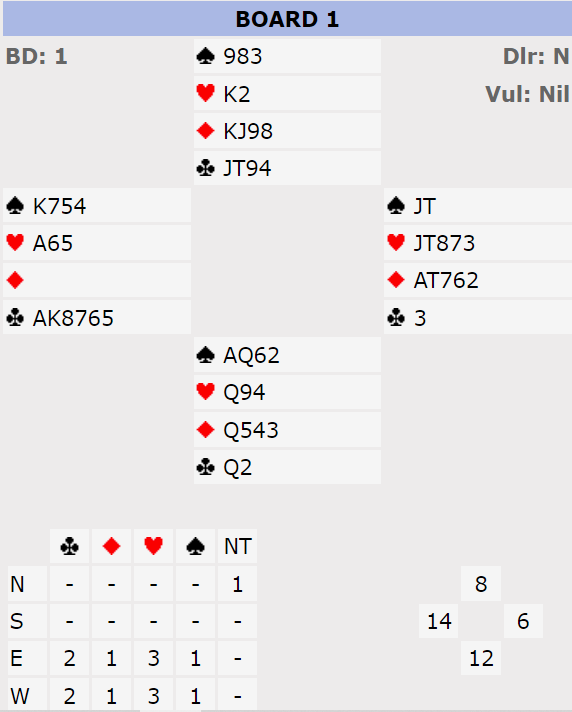 Vi kom som Ø/V høyt nok, i 4 hjerter. Som du ser er det veldig få tapere, men med kun 5-3 tilpasning er det ikke så mange stikk likevel. Som du ser sitter ikke kløverfargen 3-3, og det blir i teorien ikke mulig å vinne ti stikk. N/S kan på forskjellig måter bete 4 hjerter, de fleste inkluderer å få spilt trumf tidlig. Men i praksis er det alltid mulig med litt hjelp fra motparten.