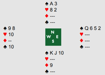 Han stakk med ruter ess, tok for hjerter ess-konge (vest la damen som falsecarding), så kløver. Øst kastet en ruter og syd stjal . Så ruter til kongen og nok en kløver. Øst kunne ikke gjøre noe fra eller til og kastet en hjerter. Deretter fridde spillefører seg med en ruter til vests dame, og disse kortene var igjen: