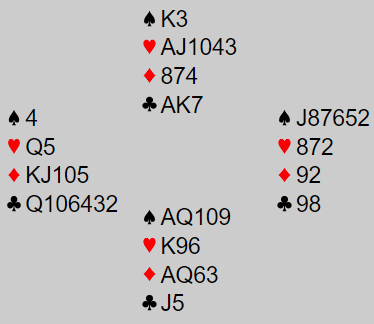 Hun tok for den siste trumfen hos syd og stakk ikke over. Da likte hun kanskje ikke helt at begge fulgte slik at trumfen satt 3-2, for nå måtte hun altså spille seg hjem i spar. Og sparen satt 6-1! Men heldigvis hadde ikke vest som hadde singel spar fra start den siste trumfen. Så inne på spar konge fikk hun tatt ut østs tredje trumf og kunne kaste to ruter på spar etterpå, +1430.