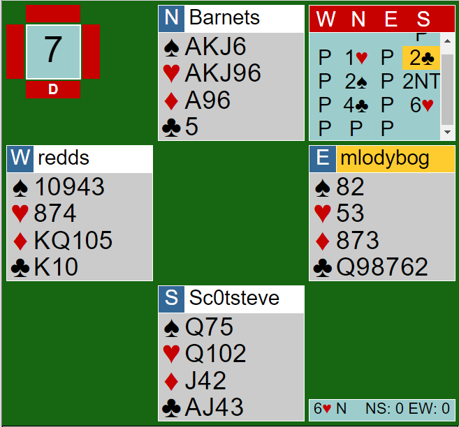 Barnet var som nord havnet i 6 hjerter og fikk kløver 9 i utspill fra øst til esset, vest fulgte med tieren.