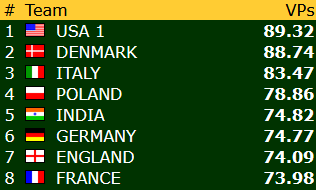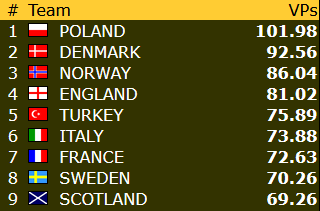 Norge har 35,39 VP etter 6 av 23 runder, og ligger foreløpig på 22.plass blant de 24 lagene.