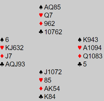 Ø/V meldte ved det bordet 4 hjerter uten noen meldinger fra N/S. Da valgte nord å spille ut kløver til kongen og esset. En spar ble spilt mot kongen, og nord tok for esset. Nå burde nok nord ha skiftet til ruter, men da han ikke gjorde det ble spillefører kvitt en ruter på spar konge og fikk til slutt hele elleve stikk. Og det bli like mange IMP (11) til Heimdal på spillet i kampen som de vant med 10 IMP.