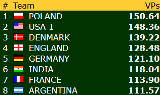 New Zealand som jeg spiller på er "ute" etter en miserabel dag i går som dog ble litt reddet av en 20-0 til slutt mot svakt plasserte Uruguay. Så avstanden opp til topp-8 er ikke helt håpløs.