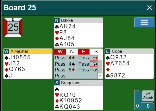 Skal en være ærlig så det ut som et butt-spill, eller trolig 1 IMP inn pga. av overstikket. Men syd har jo kun 6 poeng, så det er ikke sikkert de kommer ut i utgang ved det andre bordet. Bedre kan jo ikke det norske paret gjøre det på dette spillet, så en kan jo håpe.