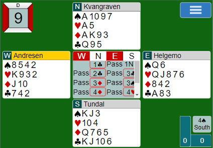 Det skjedde fordi de også hadde 4-4 tilpasning i hjerter, og da den fargen ble satt som trumf i meldingene, og Helgemo på et tidspunkt sa 5NT som storeslemsinvitt, mente Andresen AK9-sjette i en for dem sidefarge burde være godt nok til å få etablert sparfargen med en stjeling eller to i hjerterkontrakt, og han hoppet til 7 hjerter! Helgemo korrigerte til 7 NT hvor det ville blitt tre bet om ikke sparfargen hadde vist seg å være gående (kløver konge kom i utspill).