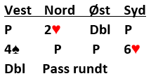 Å spille 6 hjerter doblet er glimrende, kun en doblet bet, -200. Det er jo nedlegg i 6 spar andre veien, og de kan også vinne 6 ruter som riktignok kan betes om øst er spillefører, men da må det spilles spar ut fra syd! Dessuten er -200 bedre enn å sitte mot utgang.