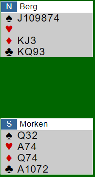 Berg så dette og stakk den andre ruteren hos syd før han tok for hjerter ess og kastet håndens siste ruter. Nå hadde han kontroll, ruterspill fra vest kan trumfes høyt på hånden. Halvparten av lagfinalens spilleførere gikk altså bet i denne utgangen.