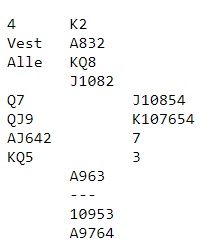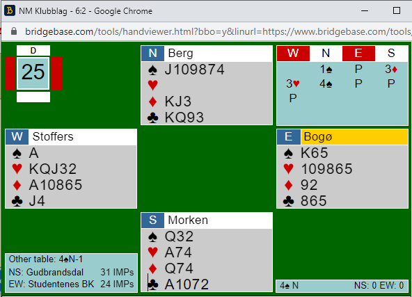 Hele fire N/S-par, inkludert Studentens BK 3 gikk bet i 4 spar etter den starten. De vant det andre ruterstikket og spilte trumf. Da var kontrakten spilt bort: