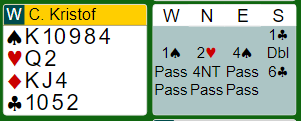 Vest fikk doblet som støttedobling (trekorts spar), og Ø/V havnet i 6 spar.