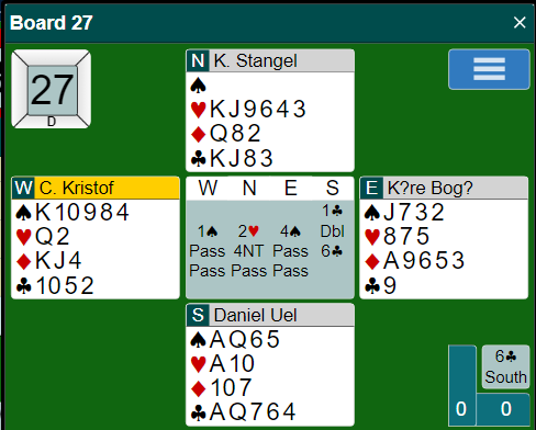 Godt meldt, og det ble greit +980 for tolv stikk da det ikke var noen kløverstjeling å hente siden syd som var resnons i kløver fikk utspillet. Merk at om vest hadde blitt spillefører villle kløver ess og kløver til stjeling betet 6 spar!
